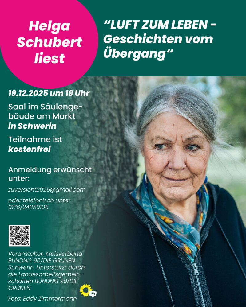 Veranstaltet wird der Abend vom Kreisverband BÜNDNIS 90/DIE GRÜNEN Schwerin. Der Eintritt ist frei, eine Anmeldung wird jedoch erbeten per E-Mail an zuversicht2025@gmail.com oder telefonisch unter 0176 / 24850106. Im Anschluss an die Lesung besteht Gelegenheit zum Gespräch mit der Autorin sowie zum Signieren der Bücher.